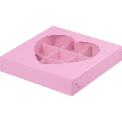 коробка бум. 155х155х30 розовая матовая, прозрачное окно сердце