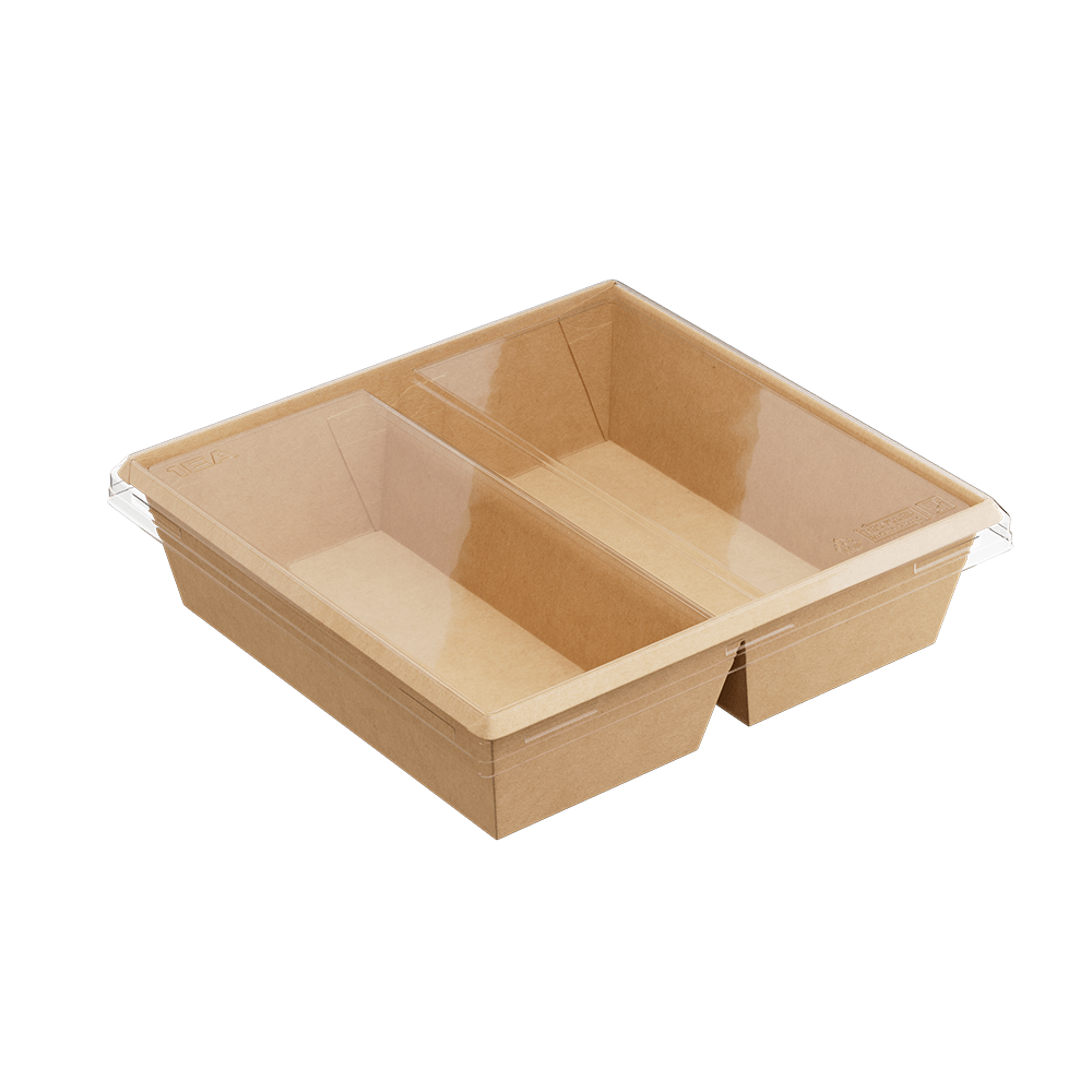 Контейнер OneClick 1200 мл 2 секционный — эко-контейнер нового поколения для доставки и презентации блюд, где важно разделить продукты по секциям; подходит для холодных/замороженных, жирных, горячих блюд и продуктов с жидкими составляющими.